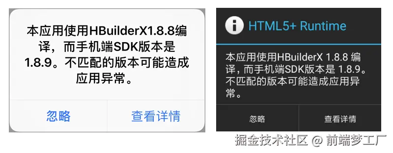 "ignoreVersion": true //true表示忽略版本检查提示框,HBuilderX1.9.0及以上版本支持