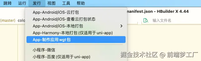 点击菜单->发行->App-制作应用 wgt 包