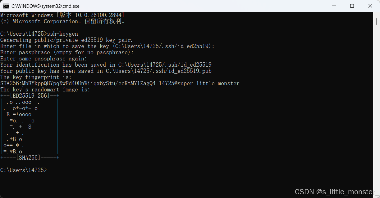 Win+R打开输入cmd打开命令行控制器,输入ssh-keygen然后一直回车就行,直到出现下面那个框框就算成功了,我们就生成了公钥id_ed25519.pub和私钥id_ed25519