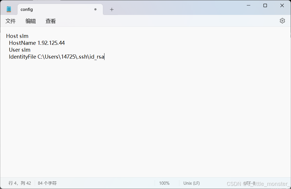 用文本打开配置后我们应该只有前三行内容,或者配置过端口的会多一行端口内容,最后一行就写C:\Users\[username]\.ssh\[filename],username依旧是电脑用户名,然后filename就是生成的私钥名,上面我们生成的私钥名叫做id_ed25519那就写id_ed25519,这个公钥和私钥与config文件是在同一目录下的,这里的IdentityFile就是私钥文件的路径,自己找着写一下,我这里生成的是我自己生成的自定义名字的,其实不需要自定义名字,让它自己生成类似id_ed25519的名字即可