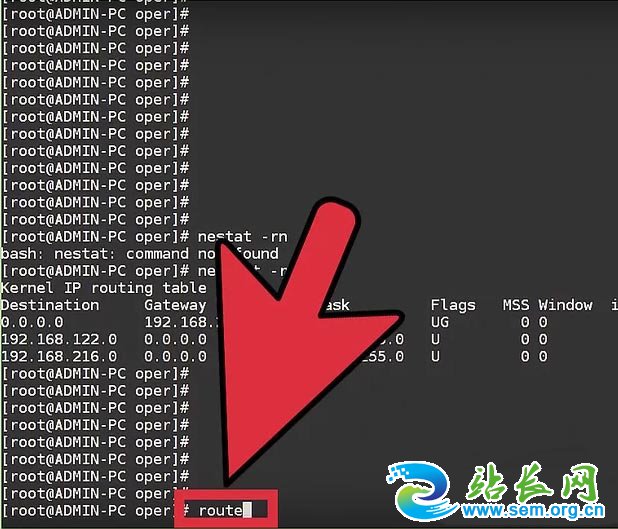 2、浏览当前默认网关信息。你可以输入route,按下Enter,来查看当前的默认网关设置。“默认”旁边的地址会显示当前默认的网关地址,它被分配到的界面则显示在桌面右侧。
