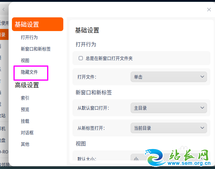4、在【设置】中点【隐藏文件】。