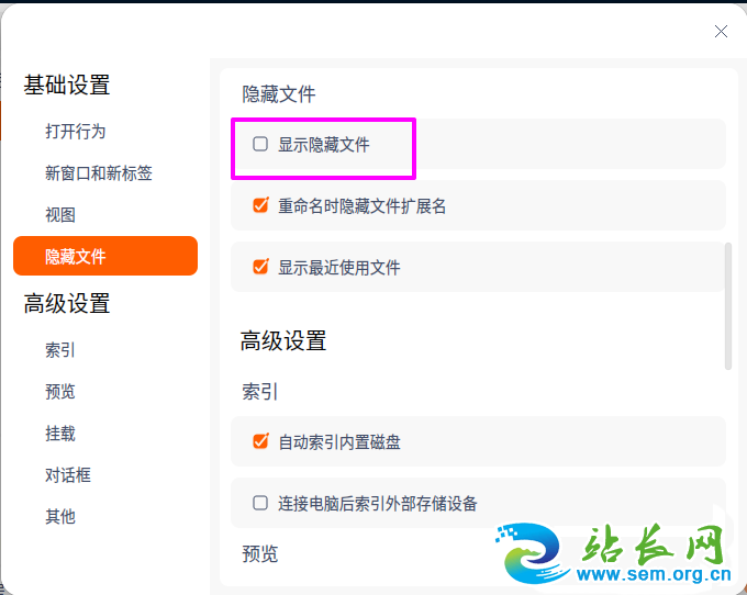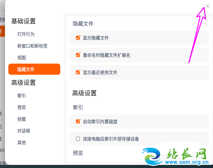 6、勾选【显示隐藏文件】,点【x】退出设置即可。