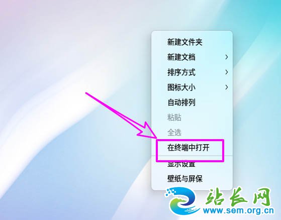 1、桌面空白处右键选择【在终端中打开】。