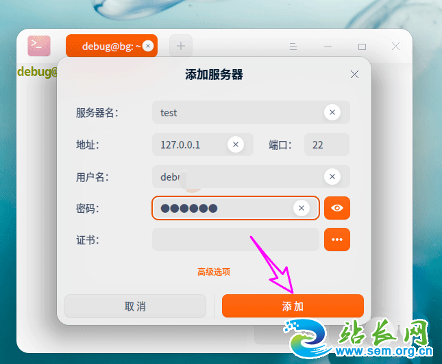 4、设置ssh服务器的的ip地址、和端口号,以及登录的用户名和密码,如果使用证书,则点【证书】一栏添加证书,如果要同时管理多个服务器,则【服务器名】设置时注意与其它服务器的区分。