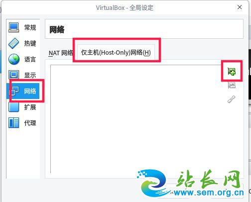 在弹出的界面,选择”网络“——”仅主机(host-only)网络“。点击如下图所示的+号添加。