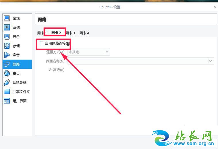 在网络界面点击“网卡2”,如下图所示,勾选“启用网络连接”。