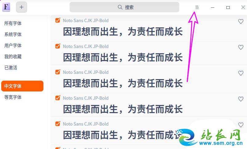 打开【字体管理器】后点右上角的下拉菜单按钮。