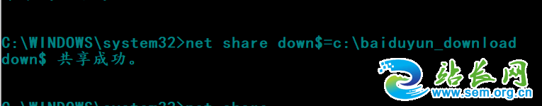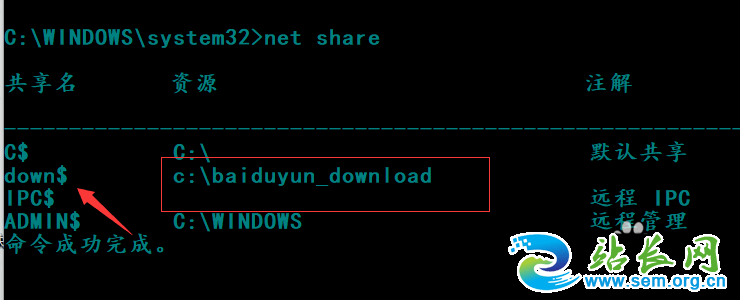 3、通过net share命令可以查看到已经建立成功。