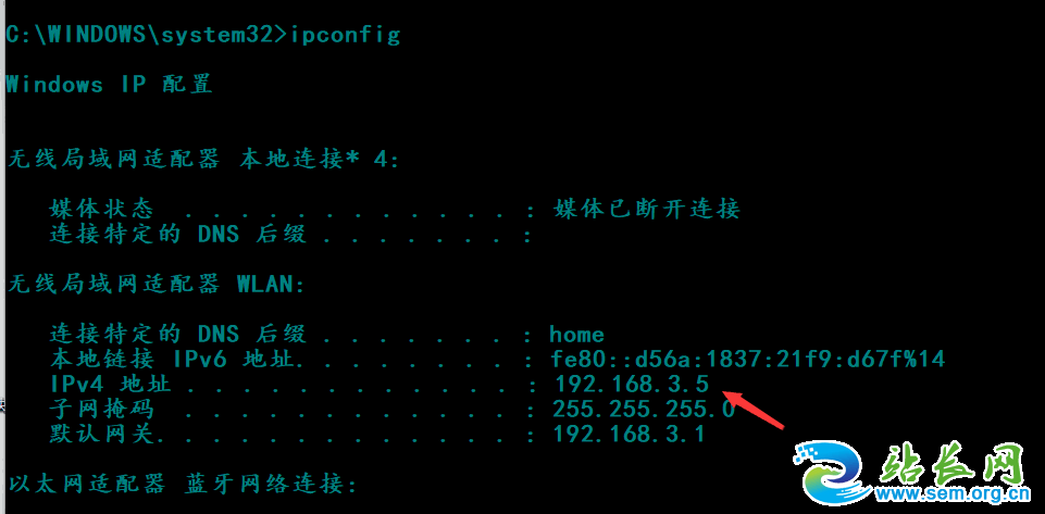 4、这时候查看一下windows机的ip地址,执行ipconfig命令。