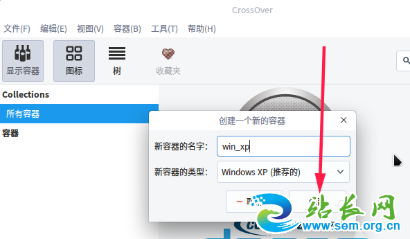 5、在弹出的窗口设置一个新容器的名字,选择新容器的类型,这里如下图所示的设置即可。