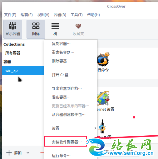 6、建立完成容器后,在左侧新建的win_xp容器中,右键选择“安装软件到容器”。