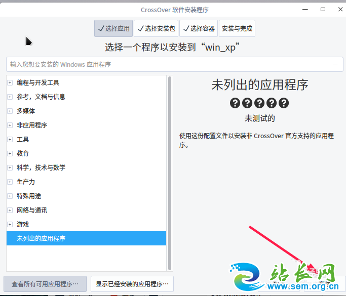 9、在新弹出的窗口选择“未列出的应用程序”,然后点击“继续”。