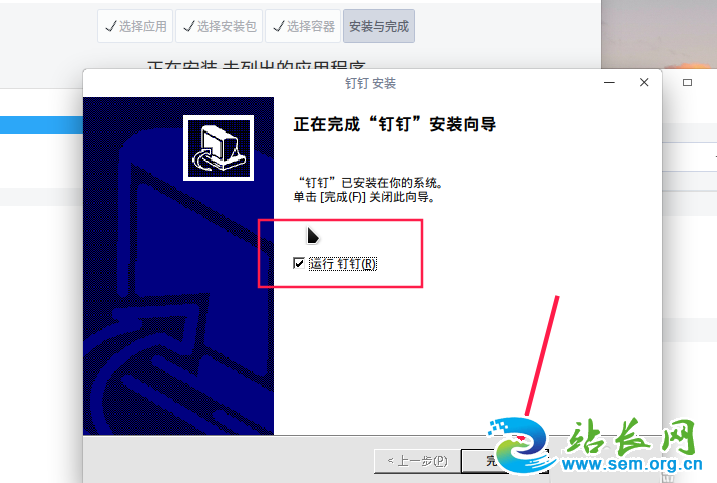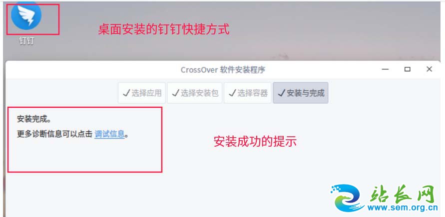 12、点击“完成“后,会出现如下图所示的内容,一个是完成安装的提示信息,一个是桌面的钉钉图标。
