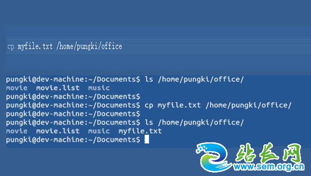 1、首先复制一个文件,需要找到这个文件所在的位置,找到之后用cp命令来进行复制,也可以输入路径来进行复制,以名为myfile.txt来为例,文件在/home/pungki/Documents目录里面,需要在文件地址输入cp命令从而实现。