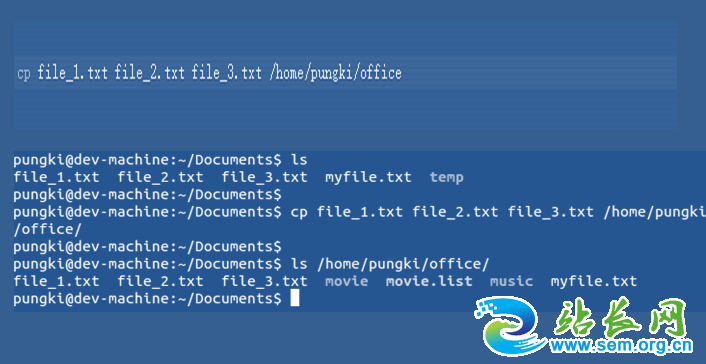 2、接着可以同时进行复制多个文件,操作其实很简单,把需要复制的多个文件用空格隔开,隔开之后就可以同时拷贝多个文件,这是cp命令的特点。