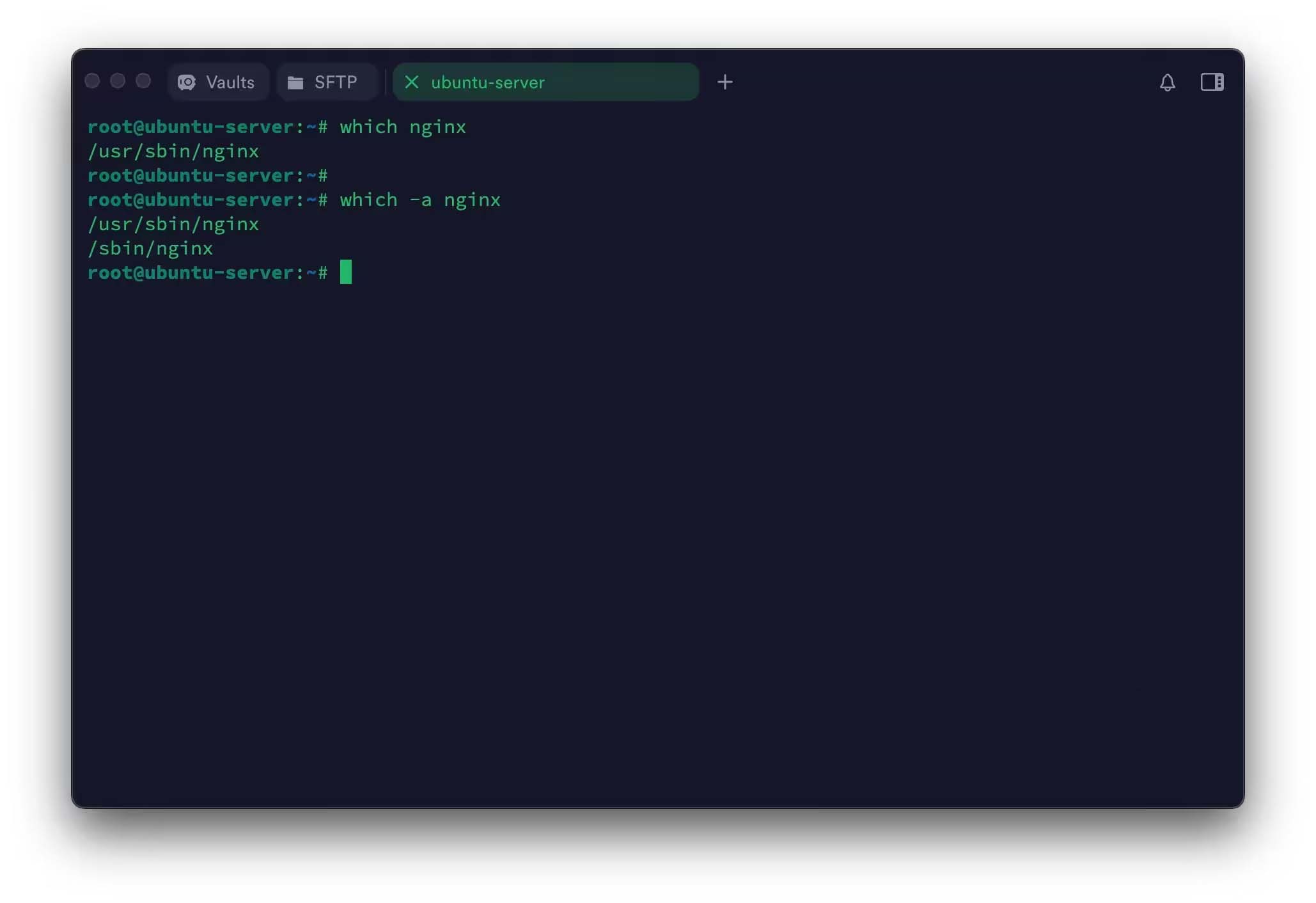 默认情况下,type只显示第一个匹配到的执行路径。如果你想看到所有路径,可以加上-a参数。例如,查找 Nginx 的实际路径: