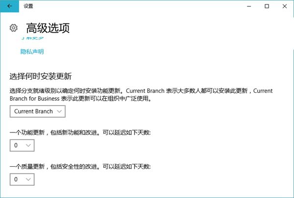 要解决这个问题,请打开设置,来到更新和安全-Windows更新,点击“高级选项”,在“选择何时安装更新”下将所有的日期均设置为0。