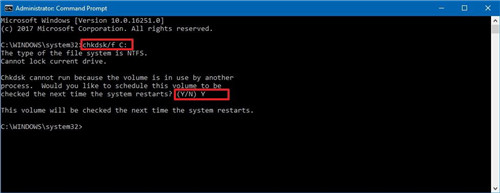 4.当卷被使用时,Chkdsk无法运行,如果是这种情况,则输入Y,然后按Enter键在下次重新引导时安排检查。