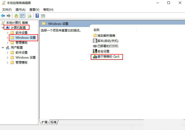 2、在打开的组策略窗口中,在左侧窗口点击“Windows设置”,然后在右侧窗口找到“基于策略的Qos”,如下图所示: