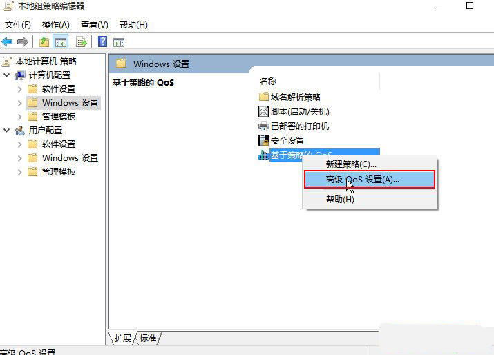 3、右键点击“基于策略的Qos”,选择“高级Qos设置”,如下图所示: