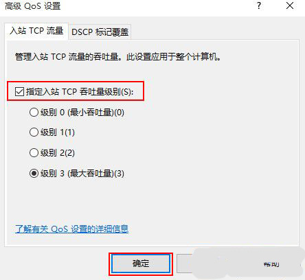 4、在打开的高级Qos设置窗口中,勾选“指定入站TCP吞吐量级别(S)”,点击确定,如下图所示: