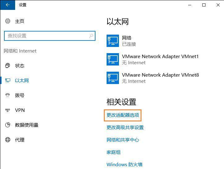 2、在网络和Internet界面,点击左侧“以太网(无线网络请点击WLAN)”,然后在右侧窗口点击“更改网络适配器设置”。