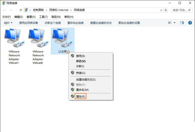 3、在网络连接窗口,对着以太网单击鼠标右键,菜单中选择“属性”。