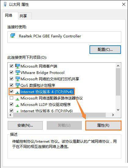 4、在以太网属性对话框,点击选中“Internet协议版本TCP/IPv4”,然后点击下面的“属性”按钮。