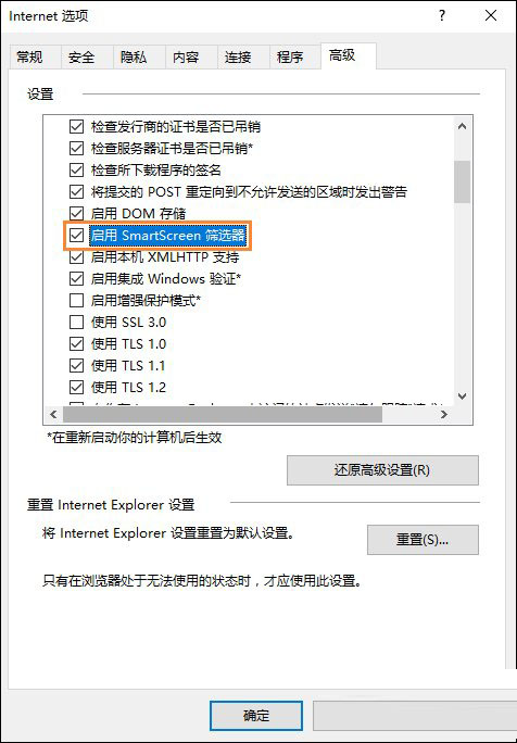 3、勾选“启用SmartScreen筛选器”确定。
