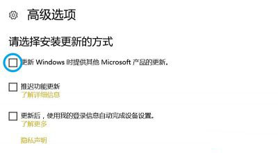 3、转到Windows 设置>更新和安全>高级选项,取消勾选“更新Windows时提供其他Microsoft产品更新”