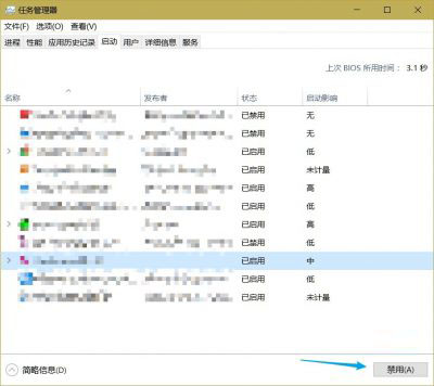 5.3:选择“ 启动 ”选项卡上,单击“ 打开任务管理器” ,在任务管理器的“启动”选项卡中依次选择每个项目,然后单击“ 禁用”。