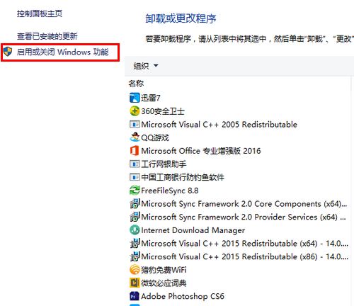 3、在卸载或更改程序中,点击窗口左侧的“启用或关闭 Windows 功能”。