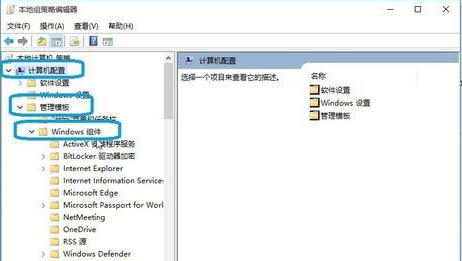 6.在本地组策略编辑器左部,依次展开“计算机配置->管理模板->Windows组件。