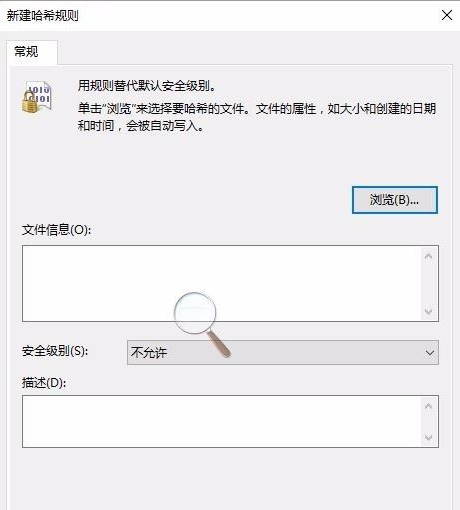 在新建哈希规则对话框安全级别下拉列表框单击下拉箭头,选择“不允许”,然后单击确定。