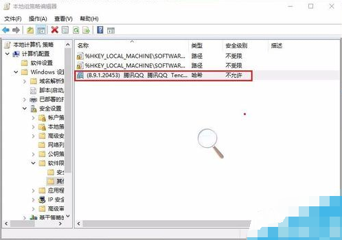 弹出如下图所示对话框,在右边的窗格中,我们会发现多出一条哈希规则,如图所示。这时再双击桌面上的QQ快捷图标,QQ就不能打开了。