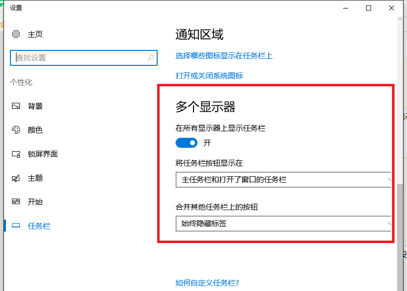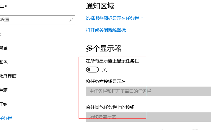 3、鼠标往下拉动滚动框,到达多个显示器项目,“在所有显示器上显示任务栏”处点击关,使得在非显示屏不显示任务栏
