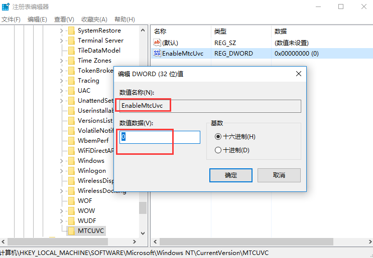 3、打开MTCUVC项,在其中新建一个DWORD(32位)值,命名为EnableMtcUvc,并将其值设置为0,然后重启电脑就可以了,音量条就变成了竖向。