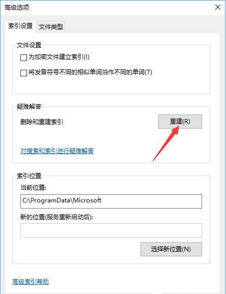 3、在高级选项窗口中有“重建”按钮,点击即可删除和重建索引。