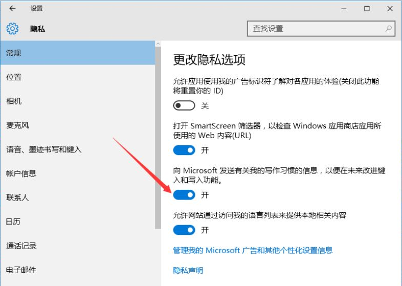 2、在隐私界面的常规选项中,确保打开了“向Microsoft 发送有关我的写作习惯的信息,以便在未来改进和键入和写入功能”。