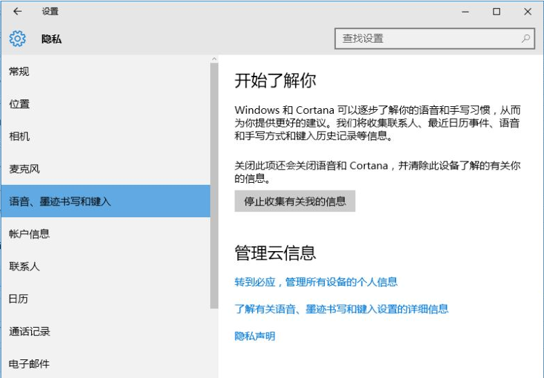 3、在隐私界面的“语音、墨迹书写和键入”选项中,确保此项已开启,如图所示,如果显示的是“了解我”按钮,则点击“了解我”开启此功能。