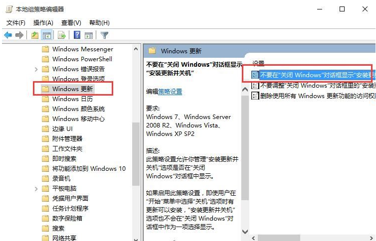 2、依次打开用户配置→管理模板→windows组件→windows更新,在右侧双击打开“不要在关闭windows对话框显示安装更新并关机”的属性。