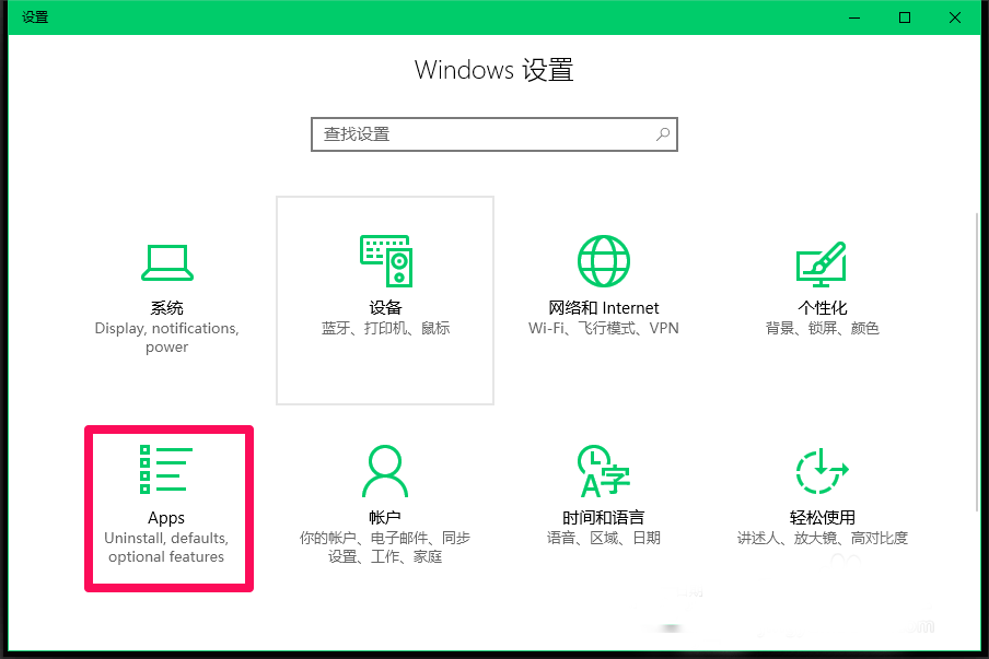 1、新增了一个Apps(应用和功能)项目。点击任务栏右下角的通知图标 - 所有设置,打开Windows 设置窗口, 发现新增加了Apps项目;