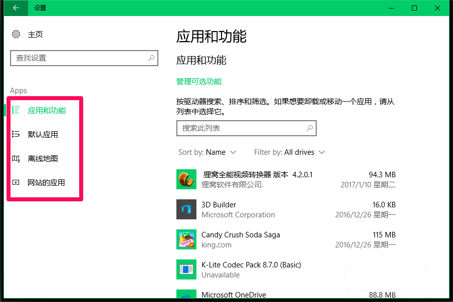 2、点击Apps,进入应用和功能窗口,Apps包含:应用和功能、默认应用、离线地图和网站的应用等项目;
