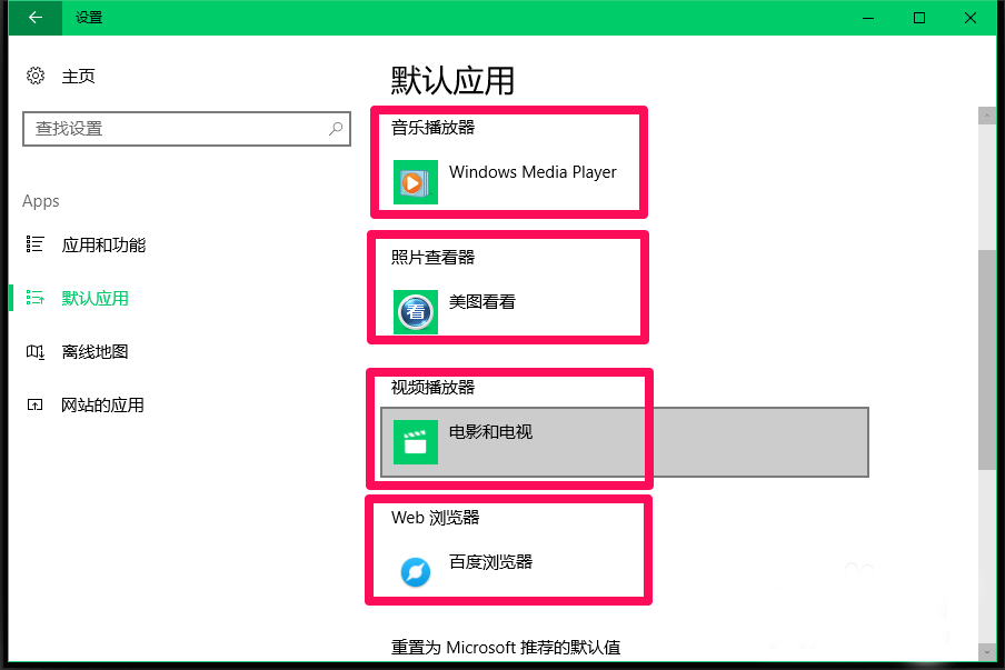 3、这些项目原来包含在【系统】项目中,如【默认应用】,点击打开就可以设置:音乐播放器、照片查看器、视频播放器和Web浏览器等。