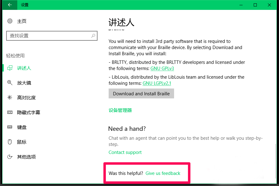 5、Windows设置的各项设置中还添加了Was this helpful? 点击:Give us feedback可以打开反馈中心。