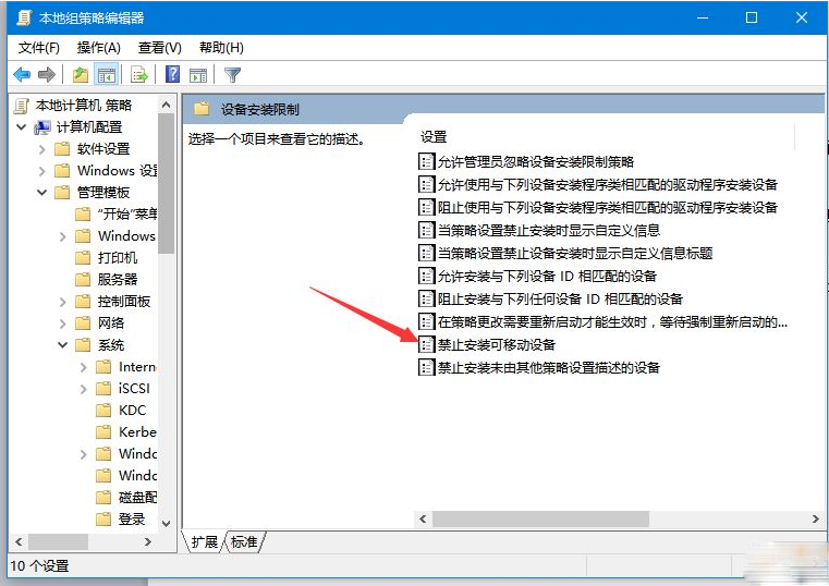 2、依次打开计算机配置---管理模板--系统--设备安装--设备安装限止项,在右侧找到并双击“禁止安装可移动设备”打开其属性。