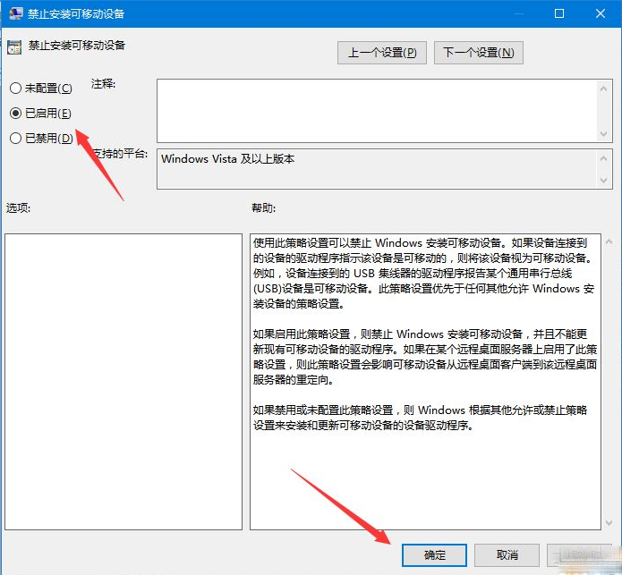 3、勾选“已启用”,然后点击确定,重启电脑让设置生效后就无法连接U盘了。