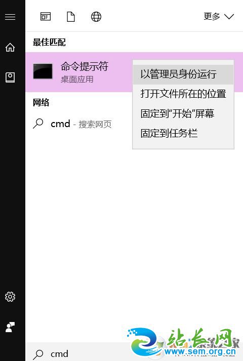 1、首先,在开始菜单输入cmd,在命令符模式下点击右键选择“以管理员身份运行”(Win7请在开始菜单的运行中输入)