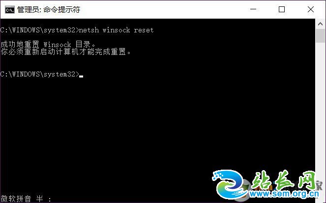 5、如果发现网页还是不能登录,请再来一条命令,输入netsh winsock reset回车,这个命令可以重新初始化网络环境,包括IP地址、DNS、网卡等等。需要注意,netsh winsock reset输入完毕后,必须重启一次电脑。